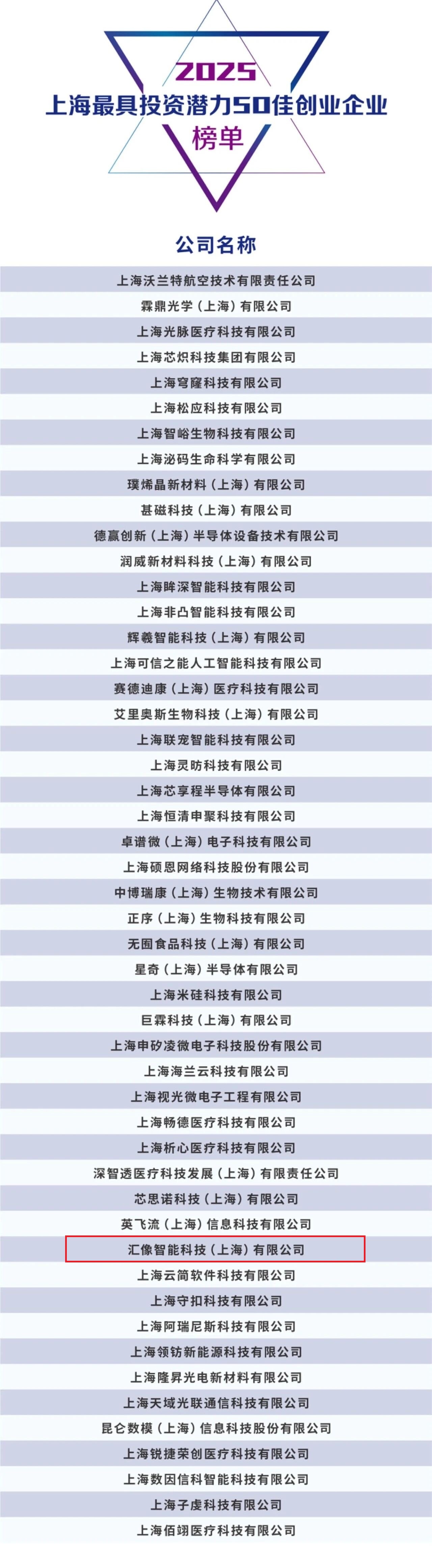 汇像智能科技(上海)有限公司凭借在生命健康自动化·智能化领域的突出贡献,成功入选“2025上海最具投资潜力50佳创业单位"榜单!